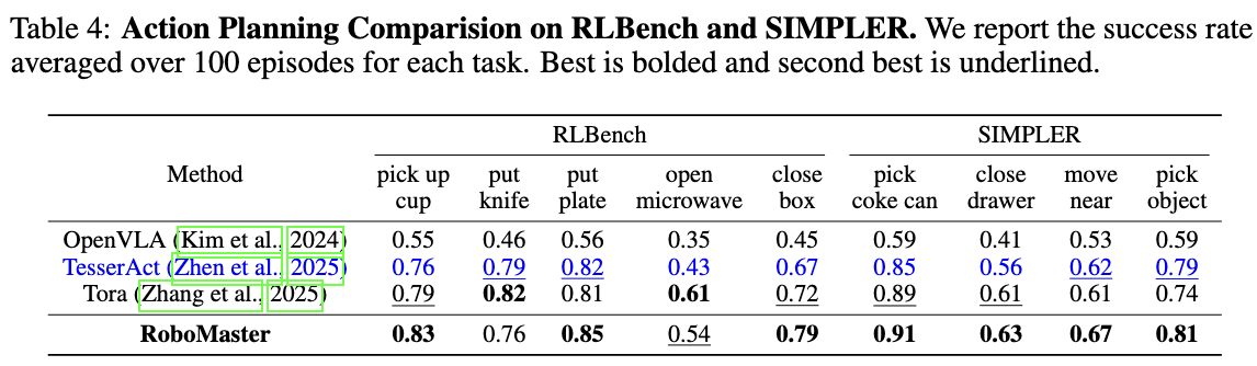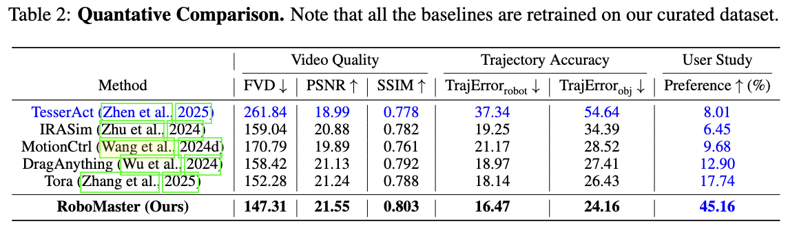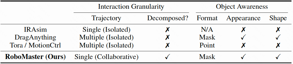 RoboMaster synthesizes realistic robotic manipulation video given an initial frame, a prompt, a user-defined object mask, and a collaborative trajectory describing the motion of both robotic arm and manipulated object in decomposed interaction phases. It supports diverse manipulation skills and can generalize to in-the-wild scenarios.