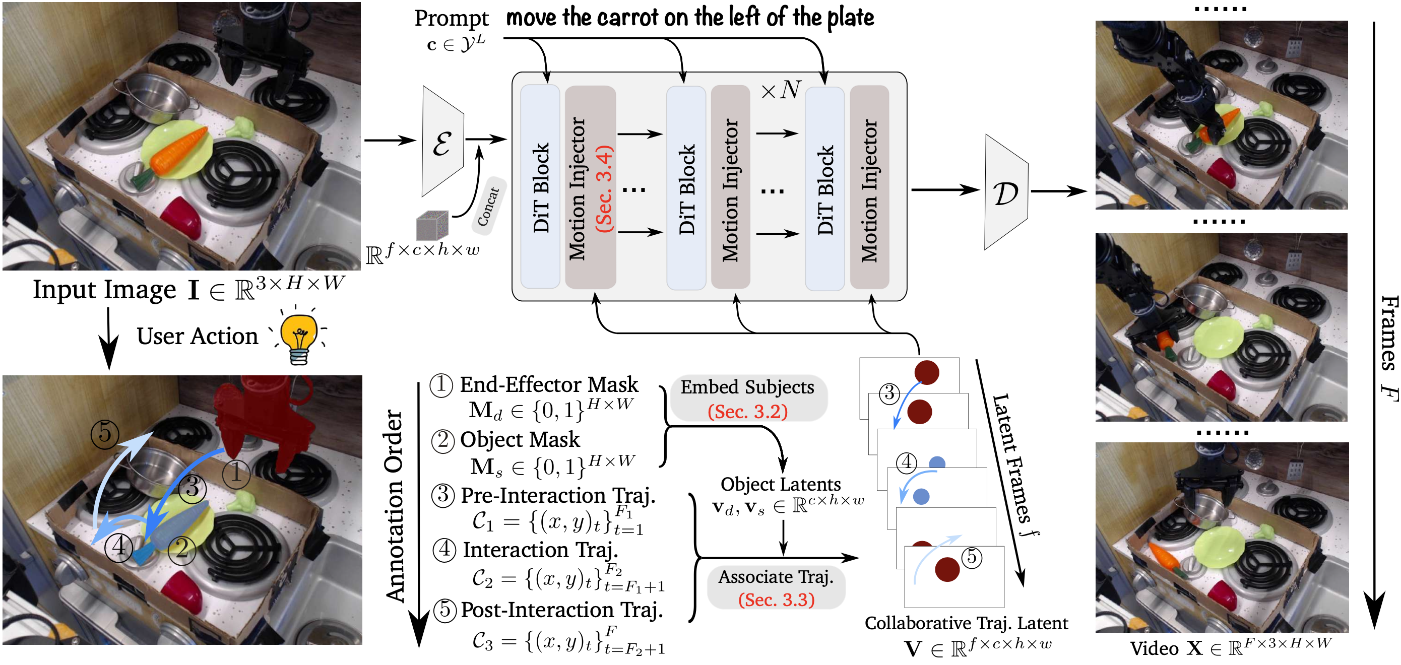 Unlike Tora that decomposes objects and uses separate trajectories to model the motion of robot arm and manipulated object, we decompose the interaction phase and unify their joint motions into a single collaborative trajectory with fine-grained object awareness. This integration alleviates the feature fusion issue in overlapping regions (see the missing apple in Tora), and improves visual quality.